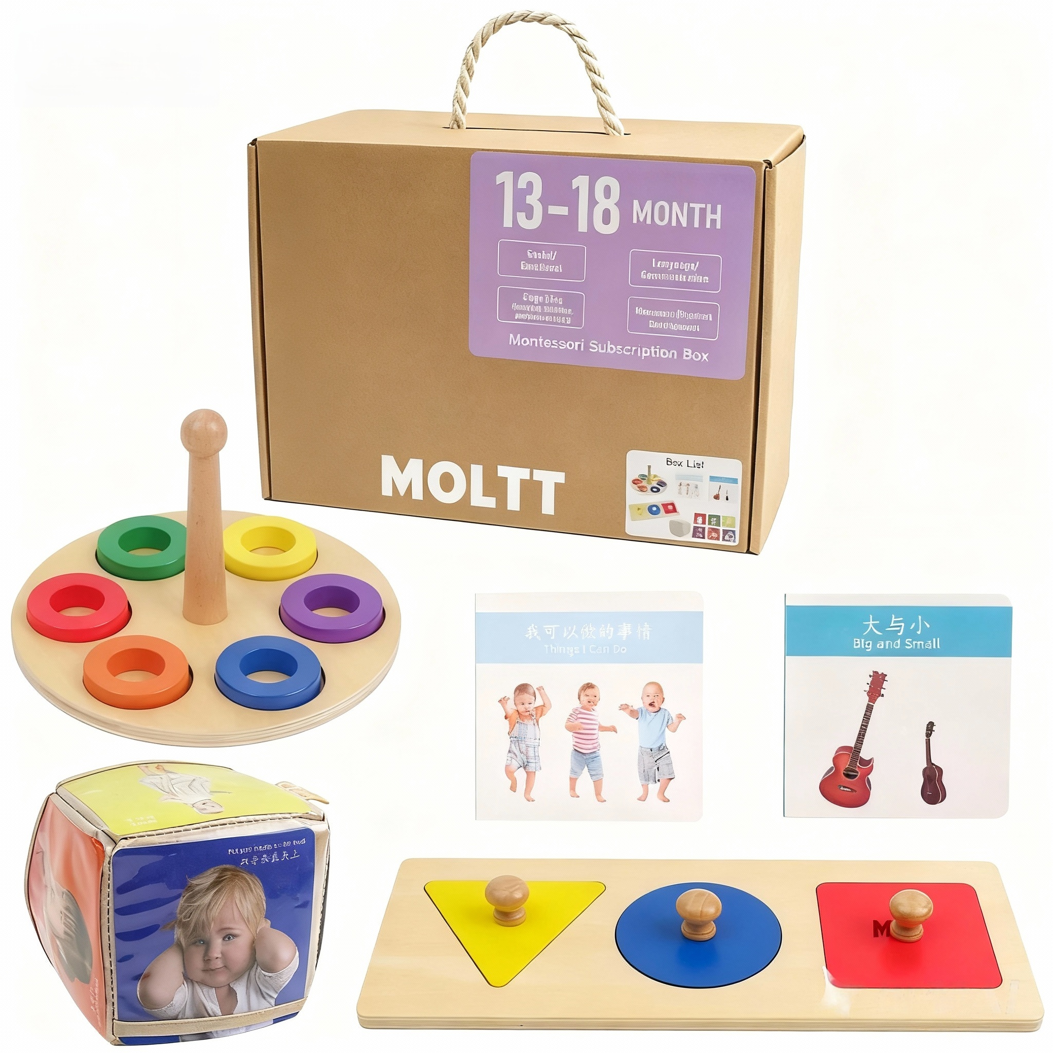 Presenta formas básicas (círculo, cuadrado, triángulo) en un diseño inspirado en Montessori que promueve la conciencia espacial, la lógica y las habilidades motoras finas.