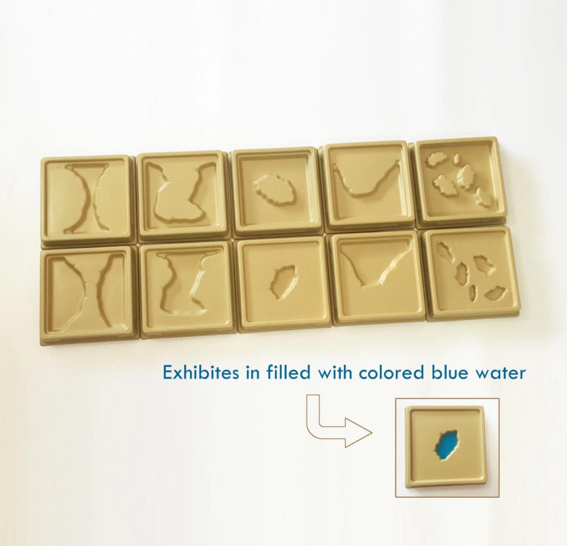 Cada forma está representada por una bandeja duradera donde la tierra está representada con madera natural teñida y el agua está representada por un acabado suave pintado de azul, creando una clara distinción visual y táctil.