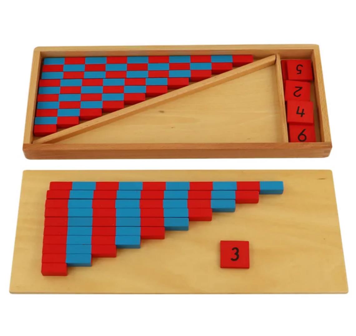Segmentos codificados por colores: cada varilla se divide en segmentos de colores alternos de alto contraste (normalmente rojo y azul), y cada segmento representa una sola unidad. Esta codificación ayuda a los niños a aislar y contar visualmente unidades individuales dentro de una cantidad mayor, reforzando la correspondencia uno a uno.