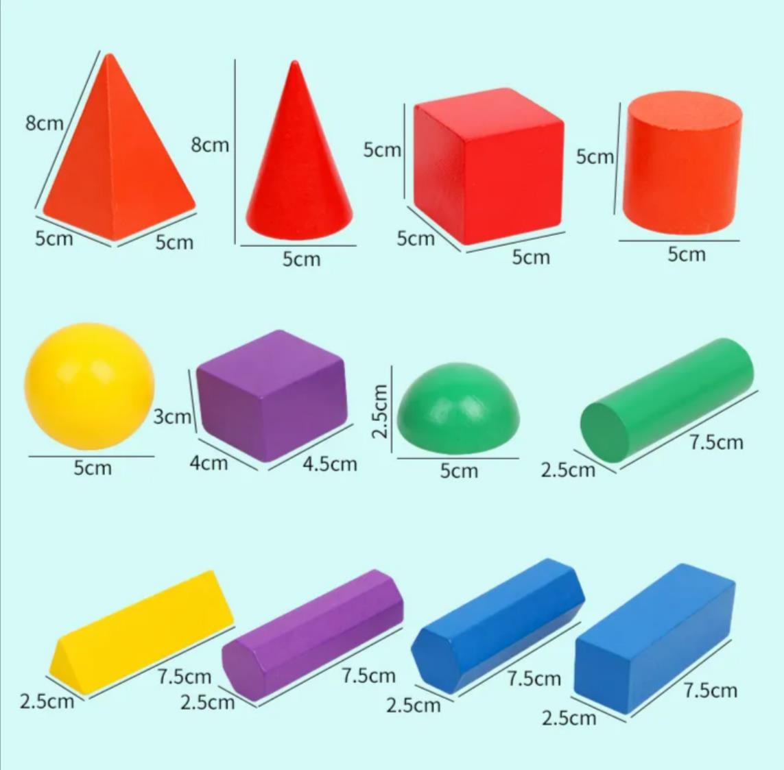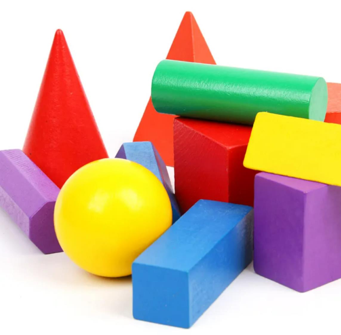 Dominio de formas y colores: el conjunto incluye una variedad de formas geométricas sólidas clásicas, como cubos, cilindros, prismas rectangulares, esferas, conos y prismas triangulares, cada uno de ellos acabado en un color llamativo y distintivo (p. ej., amarillo, rojo, azul, verde, morado). Este diseño ayuda a los niños a identificar, nombrar y categorizar fácilmente formas y colores.