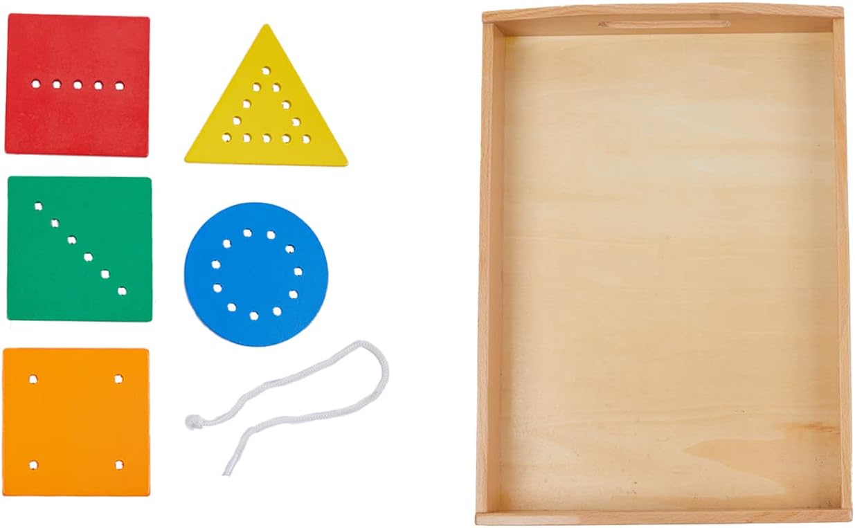 Cada forma está preperforada con pequeños agujeros. Los niños practican movimientos precisos mientras guían las cuerdas de colores incluidas a través de cada pieza, fortaleciendo la coordinación ojo-mano y refinando su control motor fino.