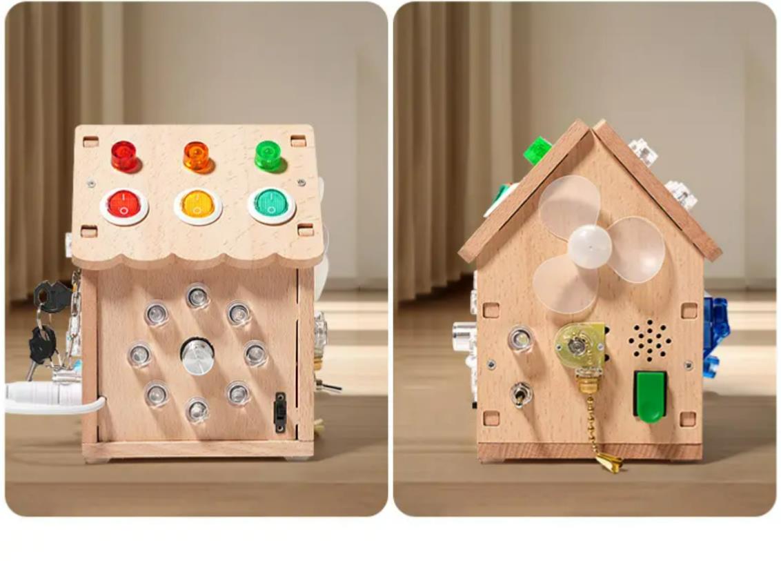 Si bien la mayoría de los tableros de actividades basados en circuitos se ensamblan con madera contrachapada en capas, los nuestros están fabricados directamente con troncos de madera maciza. Diseñado con la encantadora forma de una mini casa, este tablero integra múltiples funciones interactivas en una estructura cohesiva. A diferencia de un tablero ocupado estándar, ofrece una participación más rica y un mayor valor a través de su diseño imaginativo.
