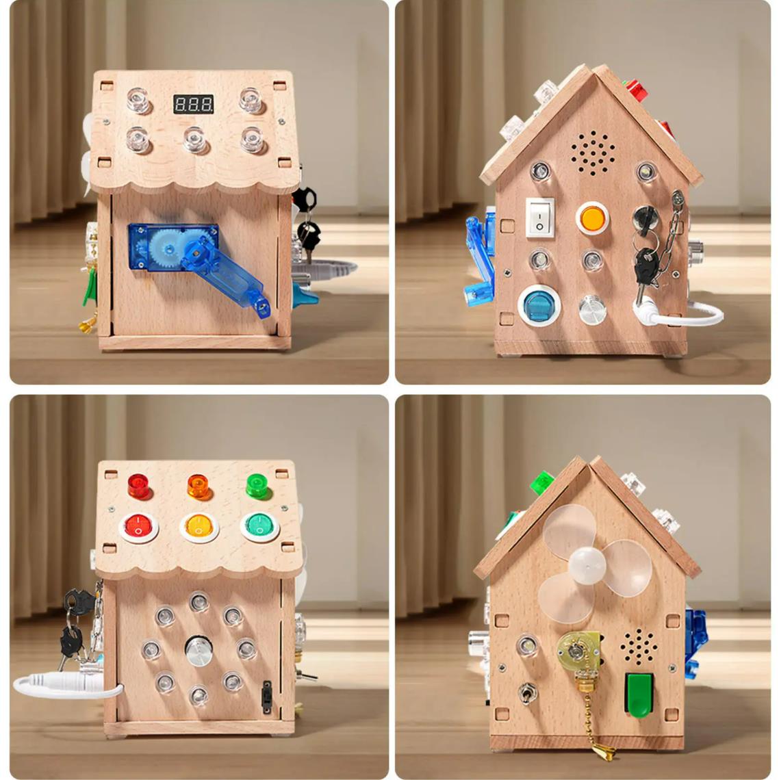 Esta casa de actividades está especialmente creada para los pequeños fascinados por las luces y los interruptores. Cuenta con una variedad de tipos de interruptores, cada uno conectado a una luz LED de diferente color o estilo. Todos los LED están cuidadosamente calibrados para ser amables con los ojos de los jóvenes: lo suficientemente brillantes como para deleitar, pero nunca ásperos ni atenuados.