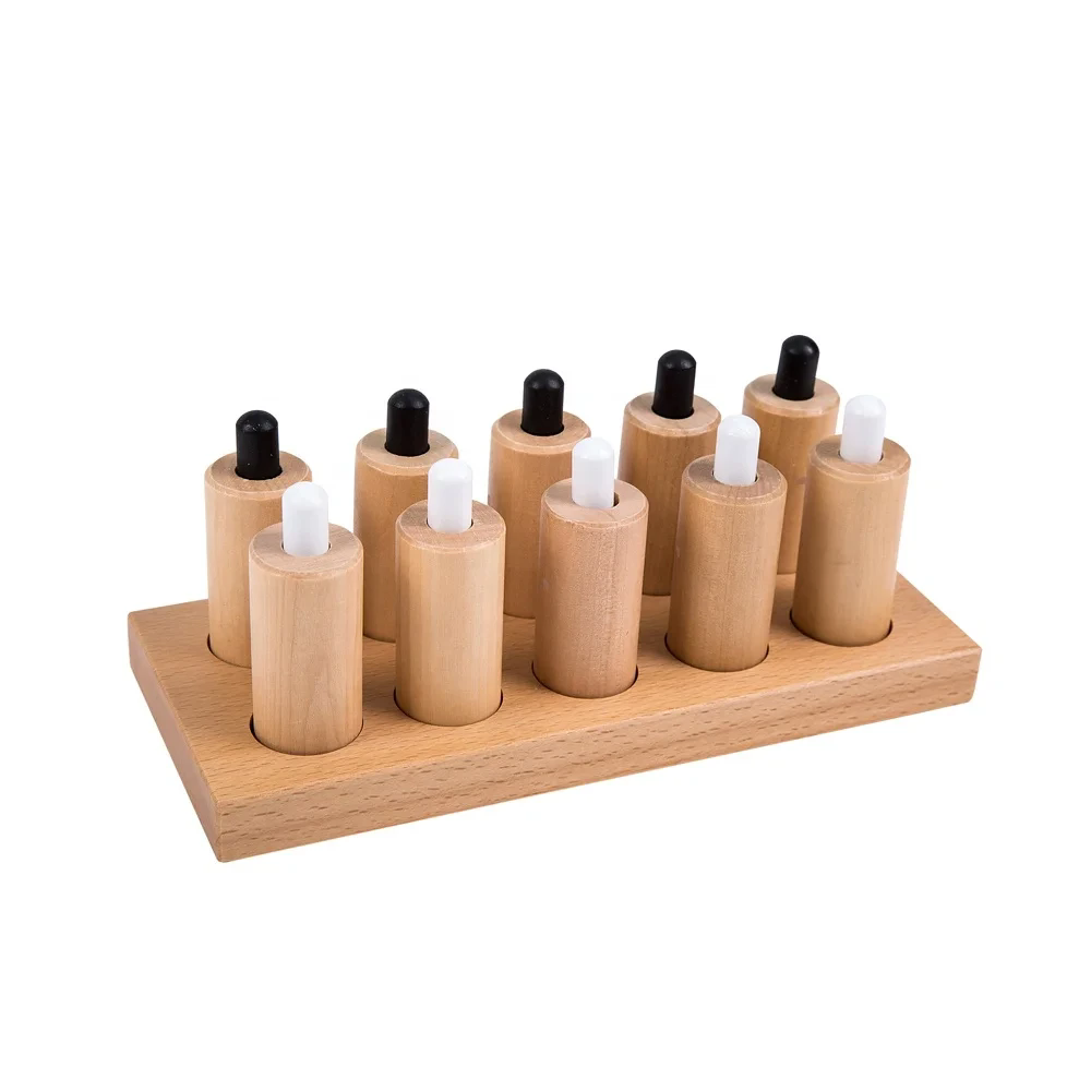 El conjunto consta de una serie de tapones cilíndricos alojados dentro de un bloque de madera largo y rectangular. Cada cilindro ofrece un nivel distinto y graduado de resistencia cuando se presiona con los dedos del niño o con una herramienta proporcionada. La progresión de una resistencia ligera a una firme es precisa, lo que permite una discriminación clara y un orden secuencial.