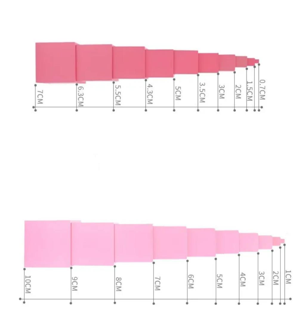 Un material educativo clásico y esencial inspirado en Montessori, este juego consta de diez cubos de madera maciza elaborados con precisión en un acabado rosa suave. Sus dimensiones progresan sistemáticamente, y cada cubo aumenta su ancho en 1 centímetro, creando una serie desde el cubo más pequeño de 1 cm hasta el cubo más grande de 10 cm. Este juego está diseñado para usarse con el soporte o base de madera correspondiente, que normalmente se ofrece como accesorio complementario.