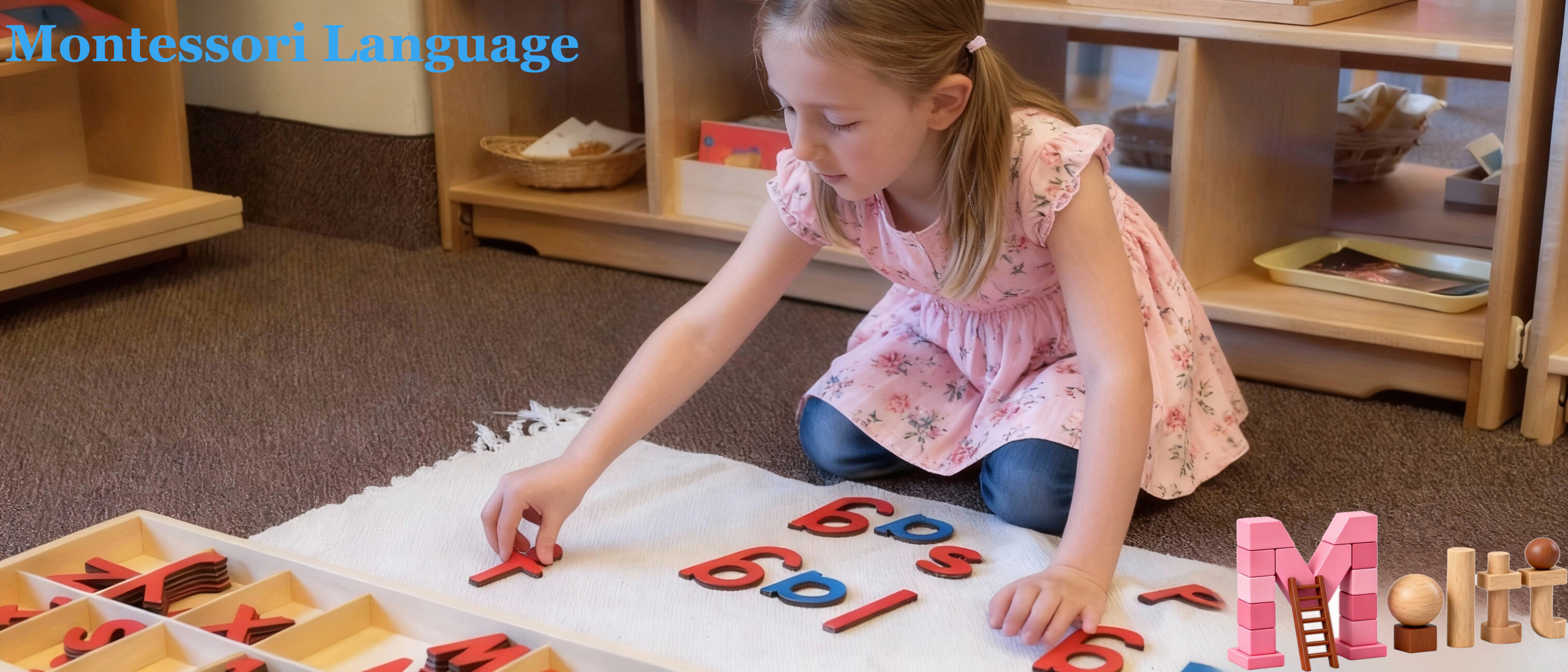 The **Montessori Language** curriculum begins long before the child picks up a pencil, starting with auditory discrimination and indirect preparation for writing. The ultimate goal is to enable the child to unlock the secrets of language through tactile and visual experiences.